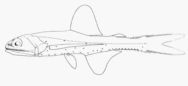 - 型態特徵:體細長,側扁,後部略細。頭略大。吻短,前端突出。眼大。口大,上頜骨狹長而延伸至前鰓蓋後緣,末端略擴大;上下頜、鋤骨、顎骨均具齒帶。體被大而薄圓鱗,易脫落;側線平直。背鰭單一,位於體中部,具軟條13-15,後部另具一脂鰭;臀鰭基底長於背鰭基底,具軟條16-20;胸鰭細長,末端達臀鰭前方,軟條數11-13;尾鰭叉形,尾鰭副鰭條堅硬而呈棘狀。各部位之發光器位置於下:眶前發光器(Ant)無;鼻部背位發光器(Dn)無;鼻部腹位發光器(Vn)小而圓形;眶下位發光器(So)無;頰部發光器(Cp)無;鰓蓋位發光器(Op)2個,位於前鰓蓋後緣下方,Op1較Op2小,均在眼眶下緣縱線之下;胸鰭上方發光器(PLO)1個,緊臨側線下緣;胸鰭下方發光器(PVO)2個,PVO1在PVO2的前下方;胸部發光器(PO)5個;腹部發光器(VO)4個,VO2位於VO1之前;腹鰭上位發光器(VLO)位於側線下緣;臀鰭上方發光器(SAO)3個,三者排列呈鈍角狀,SAO3在側線上;體後側位發光器(Pol)1個,在脂鰭下方,在側線上;臀鰭前部發光器(AOa)4-5個,幾呈水平排列;臀鰭後部發光器(AOp)8-9個,沿尾柄腹側排列;尾鰭前位發光器(Prc)4個,前三個水平排列,Prc1位於AOp後,Prc4則在側線上,後三個Prc呈斜線排列。尾部發光腺SUGL約具2-3個及INGL約具3-5個小覆瓦狀發光鱗。脂鰭基部前方不具發光腺。
